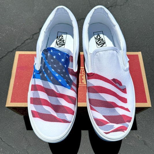 White Slip On Vans Shoes for Men and Women Featuring American Flag Made in USA - Custom Vans Shoes