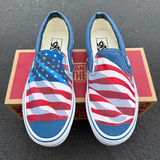 Navy Slip On Vans Shoes for Men and Women Featuring American Flag Made in USA - Custom Vans Shoes