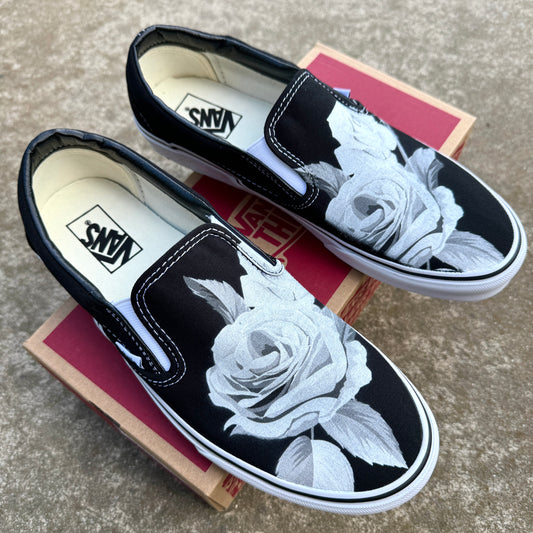 Black and White Rose on Custom Black Slip On Vans Shoes for Women and Men
