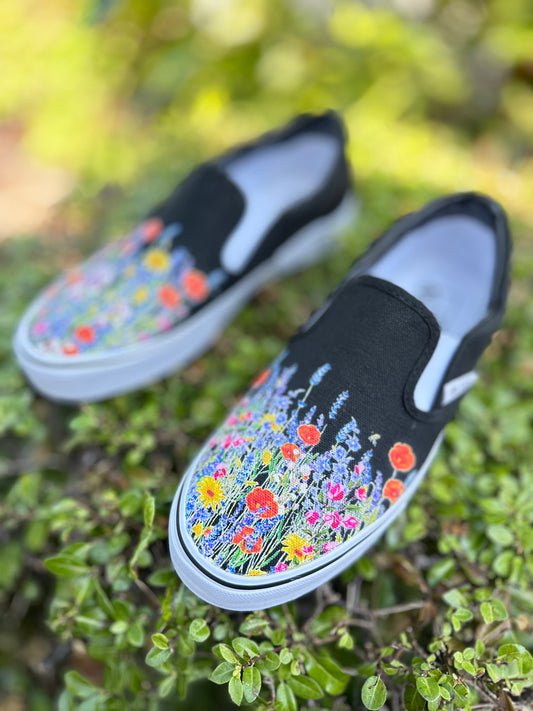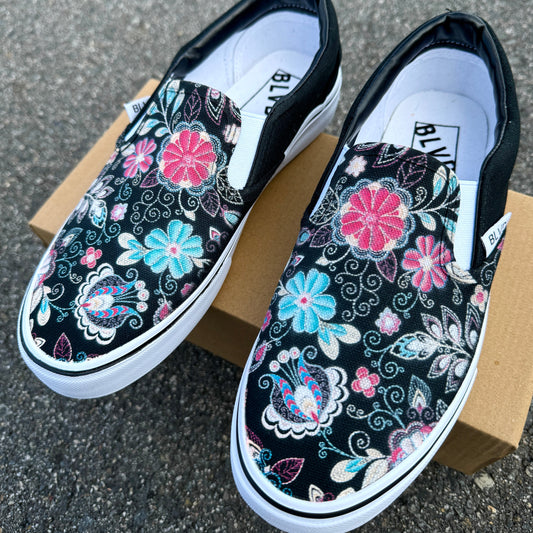 Black Slip On Shoes with Bohemian Inspired Wild Flowers on BLVD Original Slip On Shoes for Men and Women