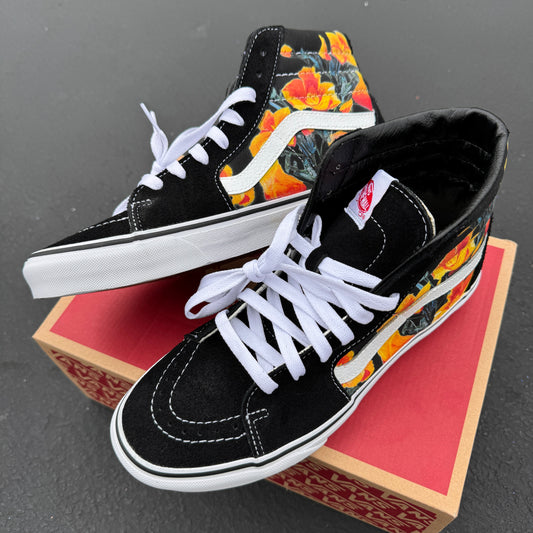 California Poppy Flowers on Black Vans SK8-Hi Shoes