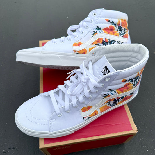 California Poppy Flowers on White Vans SK8-Hi Shoes