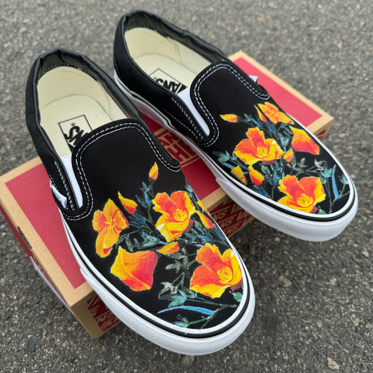 California Poppy Flower CA State Flower - Black Slip On Vans