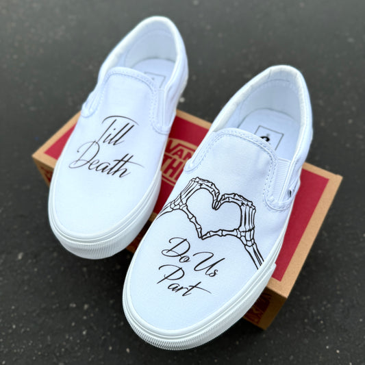 Till Death Do Us Part Skeleton Heart Hands White Wedding Vans Slip On Shoes - Custom Wedding Vans for Women and Men