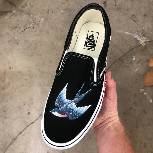 Blue & Pink Swallows - Custom Slip Ons - Custom Vans Shoes