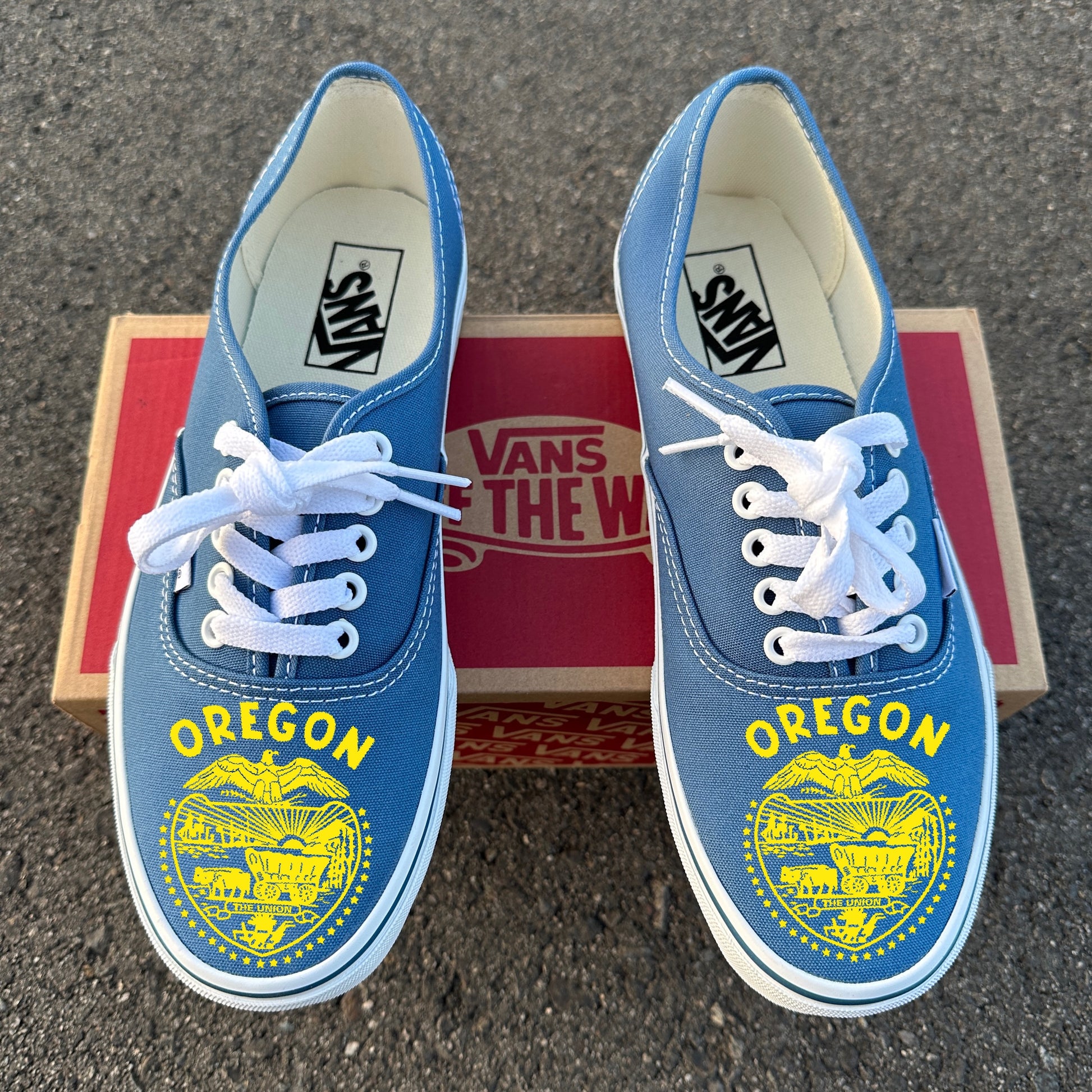 Custom Navy Vans Authentic Shoes featuring the Oregon state flag.