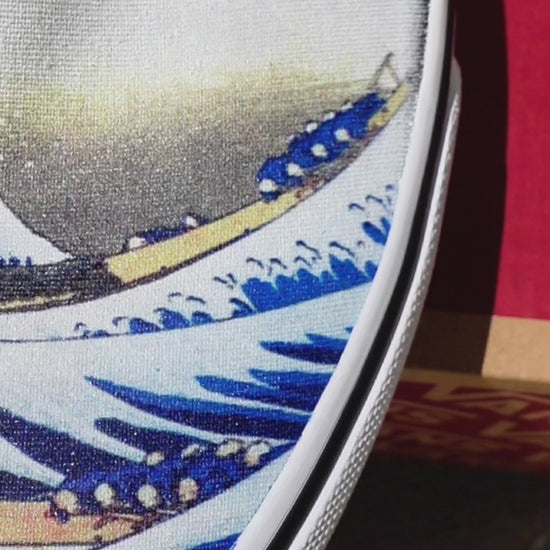 Sail away with our rendering of the traditional Japanese woodblock printed classic art piece, "The Great Wave off Kanagawa"! Who wouldn't want to ride a pair of custom printed Great Wave off Kanagawa on black Slip On Vans? These shoes are perfect for classic Japanese art fans and passionate ocean lovers alike.