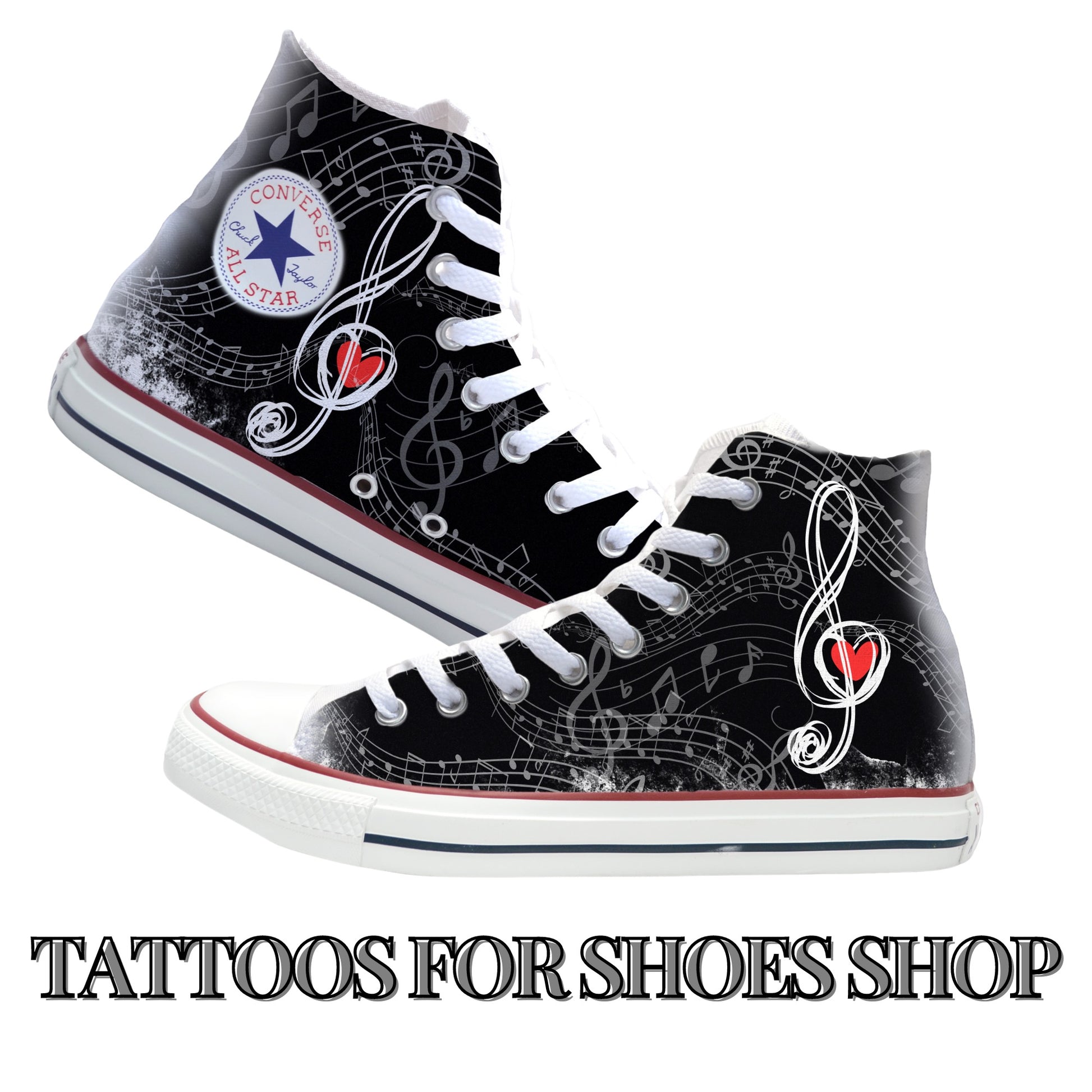 Shoes will be customized to look like the digital mock up attached. Women's size 9 white hight top Converse Chuck Taylor shoes.