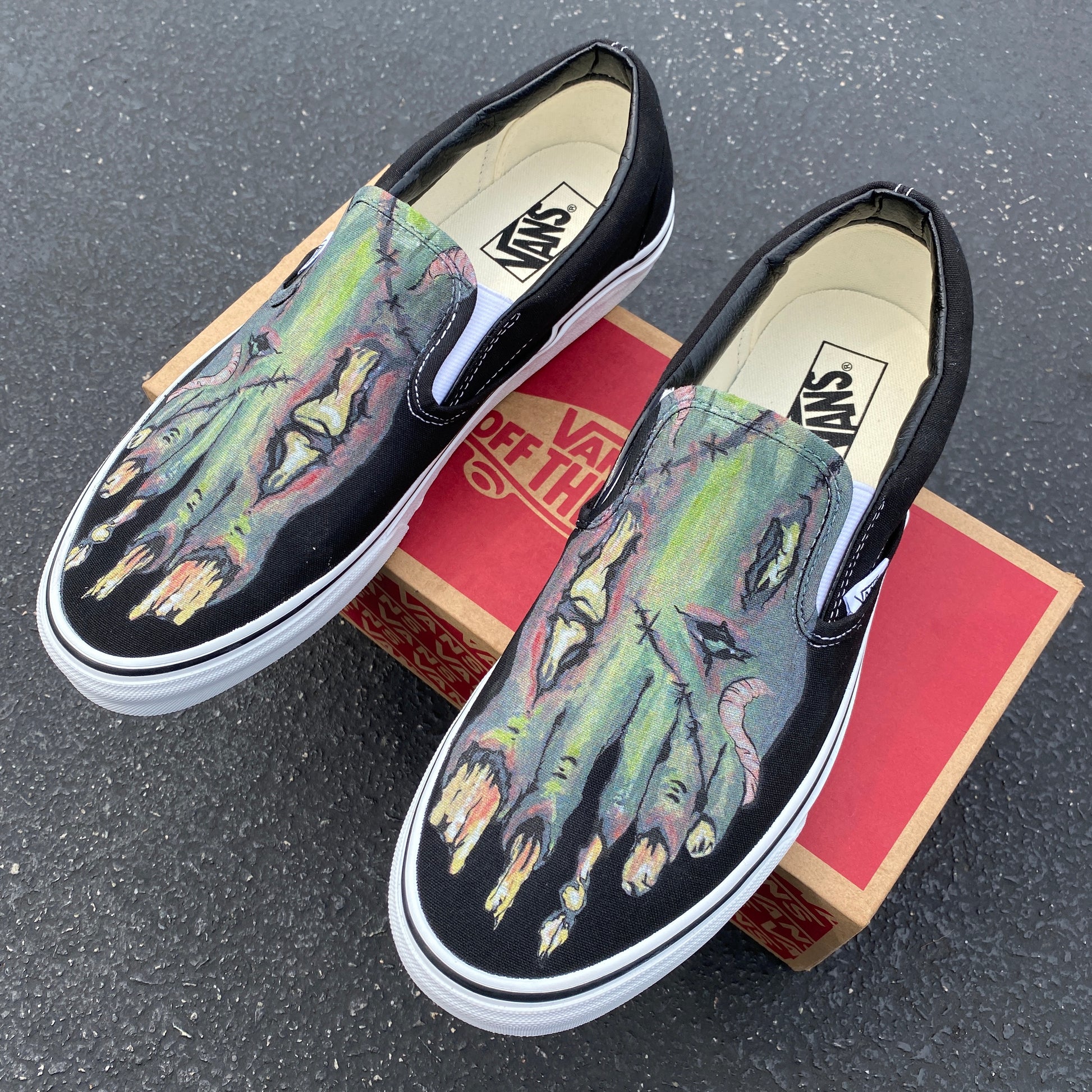 Whether you're dressing up for Halloween or want to get in the spooky spirit, these zombie feet slip-on vans are for you. Custom designed these shoes feature the decaying zombie feet including all the gross things you might find on a zombie.